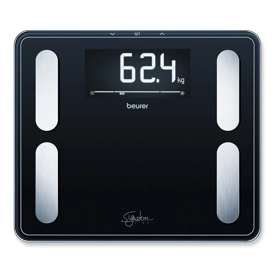 Die Diagnosewaage Beurer BF 410 mit BMI-Berechnung garantiert höchsten Komfort und Zweckmäßigkeit. Sie besteht aus hoch widerstandsfähigem Glas und hat eine besonders große Trittfläche. Sie ist für schwergewichtige Personen geeignet, da sie eine Tragkraft von 200 kg besitzt. Die Waage ist mit einem innovativen LCD-Display ausgestattet, das gleichzeitig Diagnosewerte wie Körperfett, Muskelanteil, Gewicht, Körperwasser, Kalorien und BMI anzeigt. Die Waage schaltet sich automatisch ein und beginnt zu messen, wenn der Benutzer hinauf steigt.