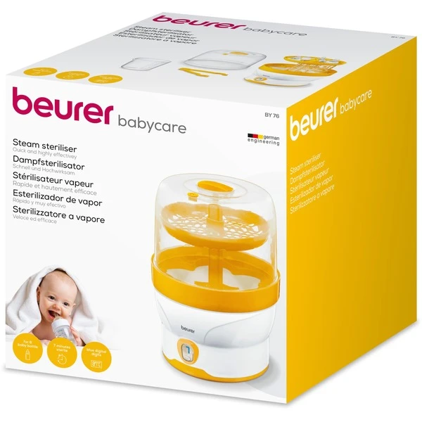 Der Digitale-Dampfsterilisator BY 76 von Beurer ist schnell, hochwirksam und besitzt ein akustisches und optisches Signal. In nur sieben Minuten lassen sich bis zu sechs Fläschchen desinfizieren. Der Digitale-Dampfsterilisator BY 76 hält die Sterilzeit bis zu drei Stunden bei ungeöffnetem Deckel. Eine praktische Greifzange ist im Lieferumfang enthalten. Alle schädlichen Haushaltsbakterien werden ohne chemische Zusätze beseitigt. Ein herausnehmbares Flaschengitter fixiert die Fläschchen.