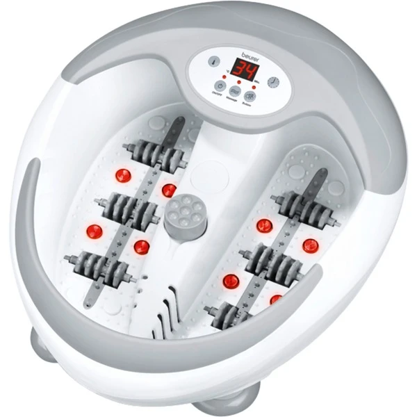Mit dem Beurer Fußsprudelbad FB50 gönnt man seinen Füßen etwas Gutes. Es eignet sich hervorragend für die Fußpflege Zuhause. Die Wassertemperatur lässt sich in fünf Stufen verstellen. Neben einer sanften Vibrationsmassage stehen auch noch ein Fußsprudelbad mit Fußreflexzonenmassage und eine Trockenmassage zur Auswahl. Weitere Besonderheiten des Fußsprudelbad FB50 sind die integrierten Magnete für Magnetfeldtherapie, wohltuende Infrarot-Lichtpunkte und das massageunterstützende Fußbett. Über einen Timer lässt sich die gewünschte Therapiedauer einstellen.
