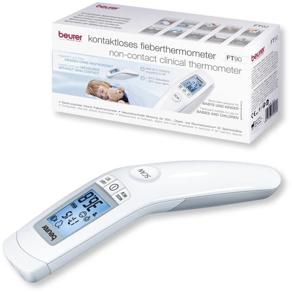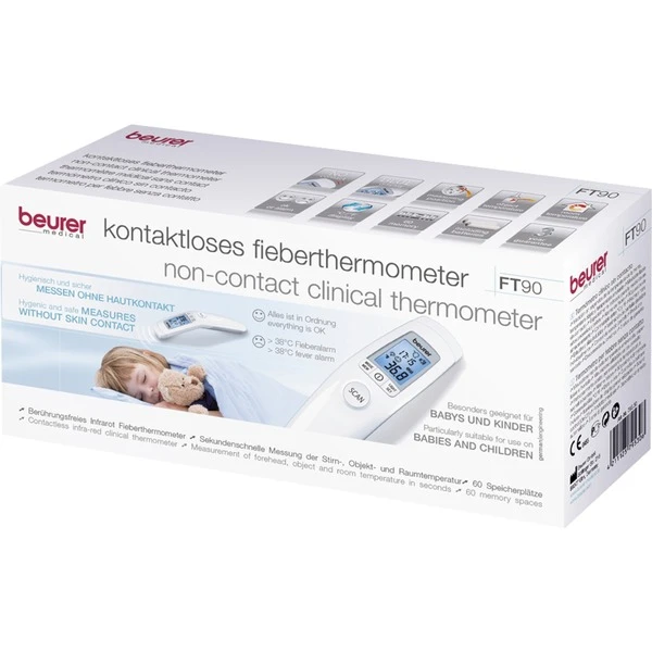 Das kontaktlose Fieberthermometer Beurer FT 90 misst die Stirntemperatur oder die Objekttemperatur hygienisch und sekundenschnell. Das Messende wird mit einem Signalton angezeigt. Das FT 90 ist besonders für die Messung bei Babys und Kleinkindern geeignet. Auf dem blau beleuchteten XL-Display, dessen Beleuchtung individuell einstellbar ist, kann die Temperatur in °C oder °F angezeigt werden und ein lachender Smiley zeigt an, wenn alles in Ordnung ist, während ein trauriger ab 38°C Fieberalarm gibt.