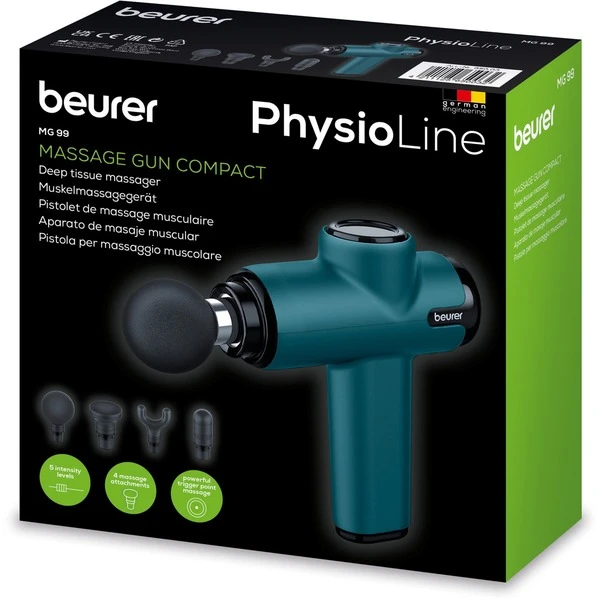 Die MassageGun MG 99 compact von Beurer trägt durch gezielte Muskelmassage zur Aktivierung und Regeneration bei. Vier Massageaufsätze und fünf Intensitätsstufen mit bis zu 3.000 Impulse pro Minute ermöglichen eine individuelle Anwendung. Die MG 99 compact ist anwendbar für alle Muskelpartien und besticht durch Leichtigkeit und Ergonomie. Der Lithium-Ionen-Akku sorgt für bis zu 5 Stunden Laufzeit.