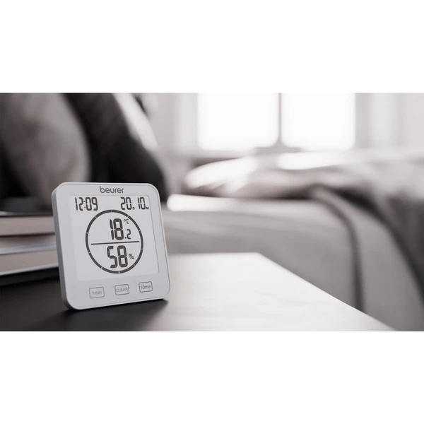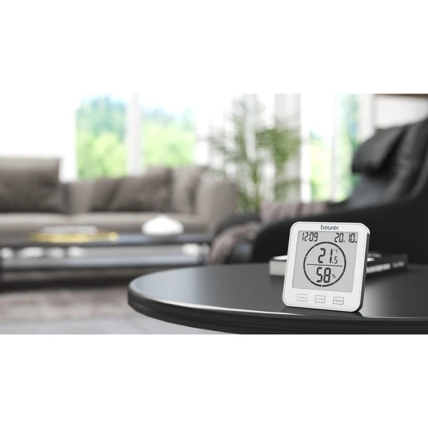 Das Beurer Thermo-Hygrometer HM 22 ermöglicht die Kontrolle über das Raumklima. Es zeigt die Temperatur, die relative Luftfeuchtigkeit sowie Datum und Uhrzeit an. Zusätzlich besitzt das Thermo-Hygrometer einen Timer, mit dem man eine Kurzzeitmessung bis 99 Minuten einstellen kann. Durch seine handliche Größe kann das Thermo-Hygrometer HM 22 überall aufgestellt werden. Auf der Rückseite befindet sich eine Aufhängevorrichtung, mit der man das Gerät auch an der Wand befestigen kann.